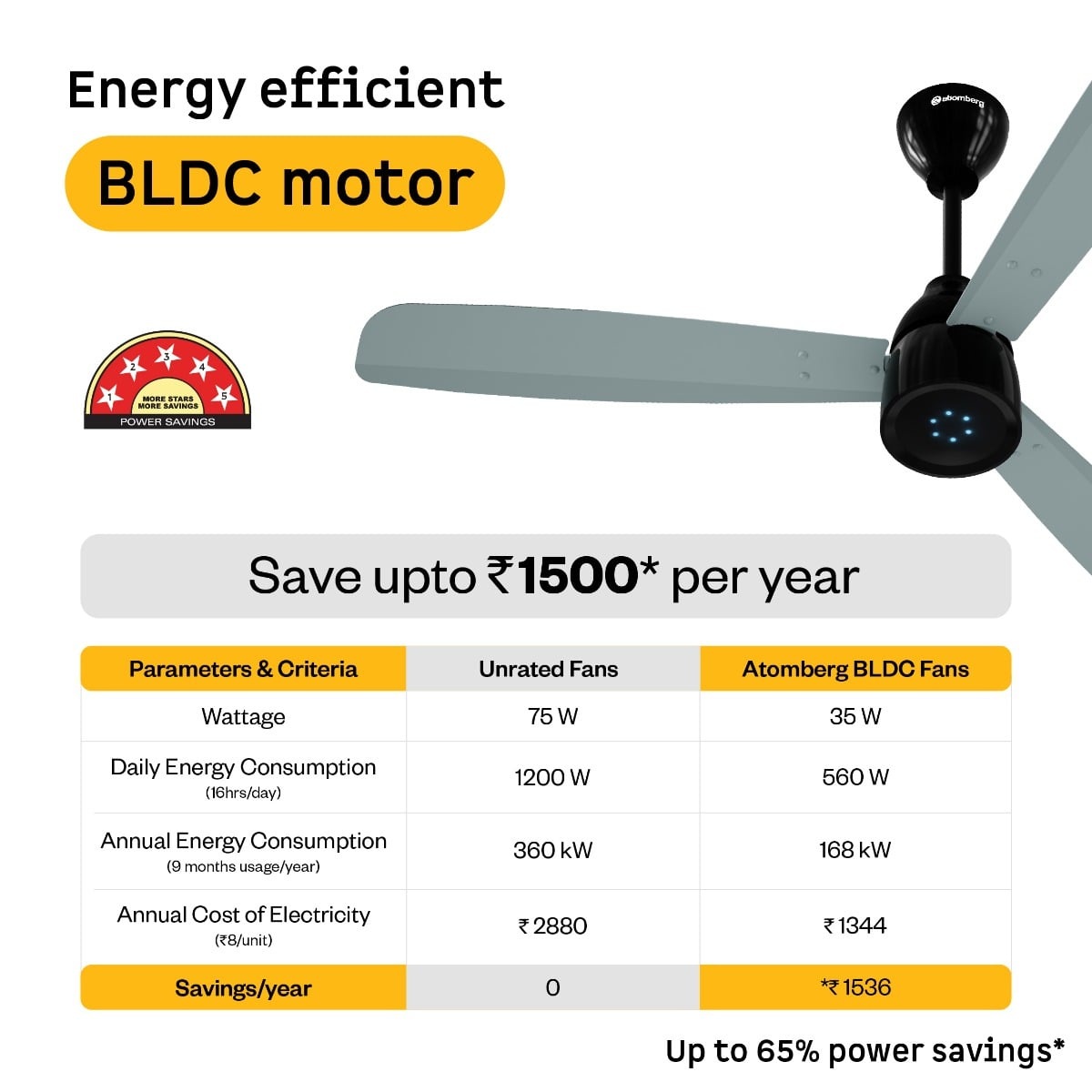 Advanced BLDC Motor Technology – Saves up to 65% electricity