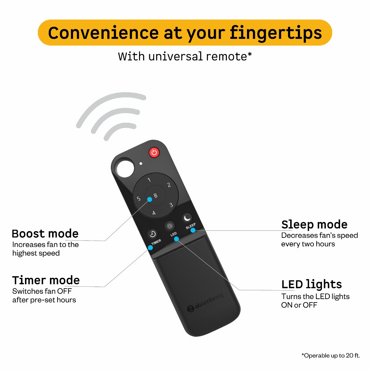 Remote Control Operation – Adjust speed, timer, boost mode, and sleep mode